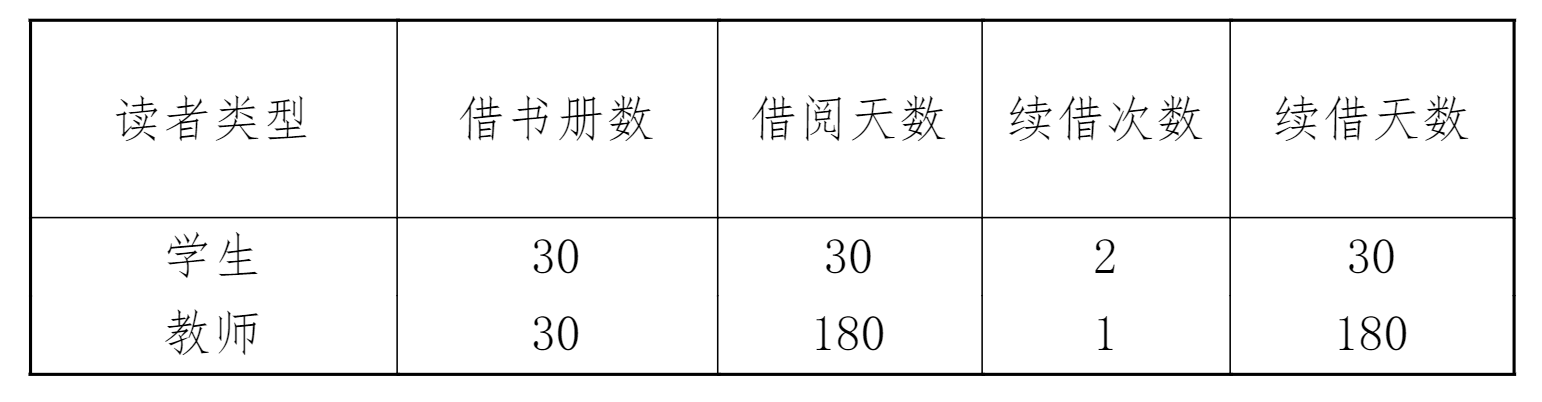 (二) 外借范围:各流通书库图书、过刊阅览室的期刊合订本均可外借,各类读者具体借书册数、借期与续借规定如表所示: