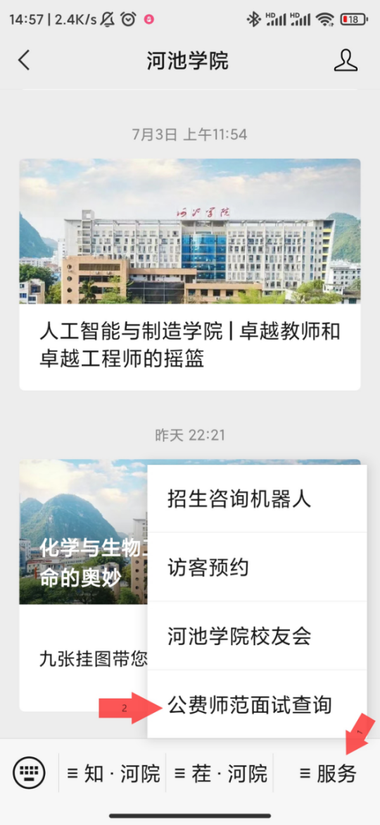 2.关注后进入微信公众号,点击“服务”,再点击“公费师范面试查询”。