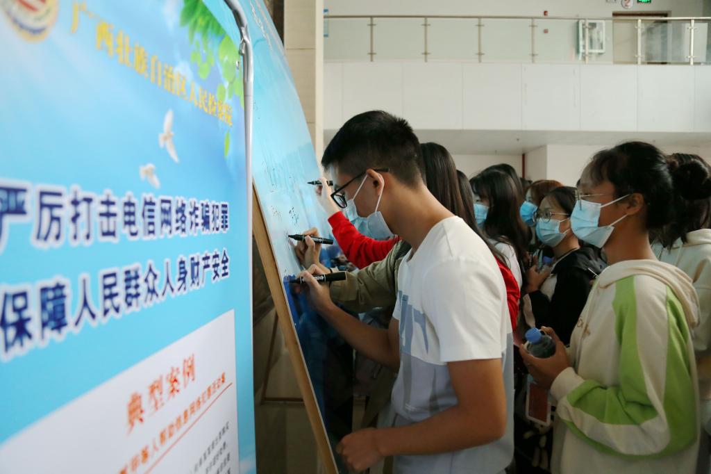 宣讲结束后,检察院工作人员还现场向师生们发放网络安全、防诈骗等宣传资料,组织学生参与“拒绝出售‘两卡’,防范电信网路诈骗”签名活动。