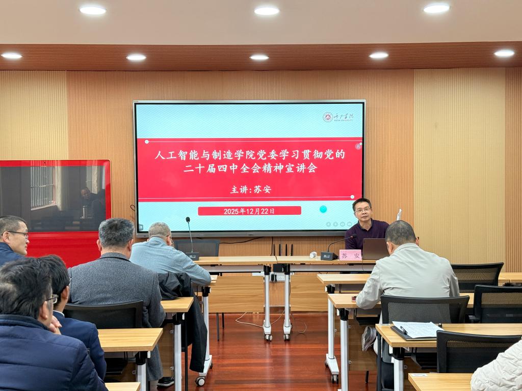 2025年12月22日,人工智能与制造学院召开深入学习贯彻党的二十届四中全会精神专题学习会,学校党委委员、副校长苏安应邀作专题宣讲。学院全体教职工及部分学生党员代表参会。