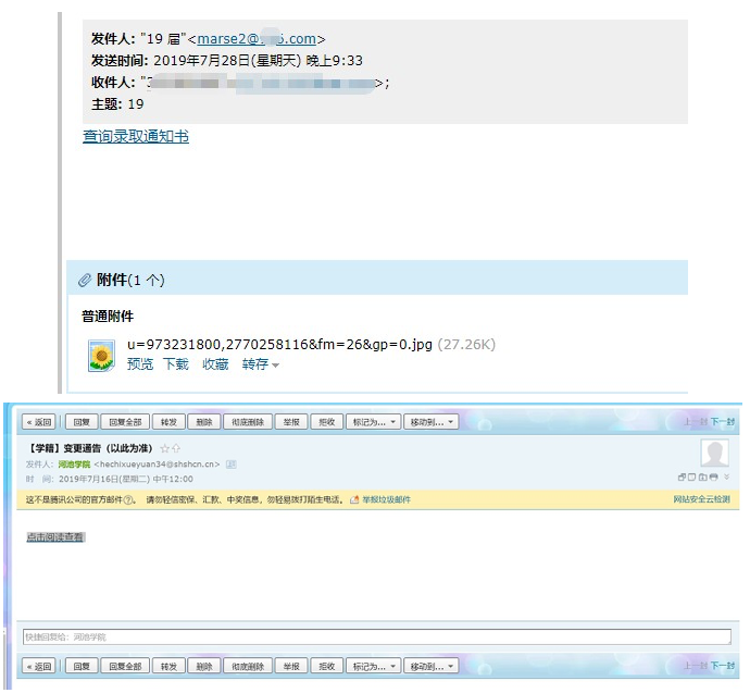 近段陆续有师生发映个人邮箱收到主题为“【学籍】变更通告(以此为准)”和“19届查询录取通知书”的邮件,用户打开邮件后,邮件正文会有类似“点击阅读查看”和“查询录取通知书”的链接,单击后会出现要求用户输入QQ用户名和密码的登陆界面,邮件正文及单击链接后的页面内容如下图所示。