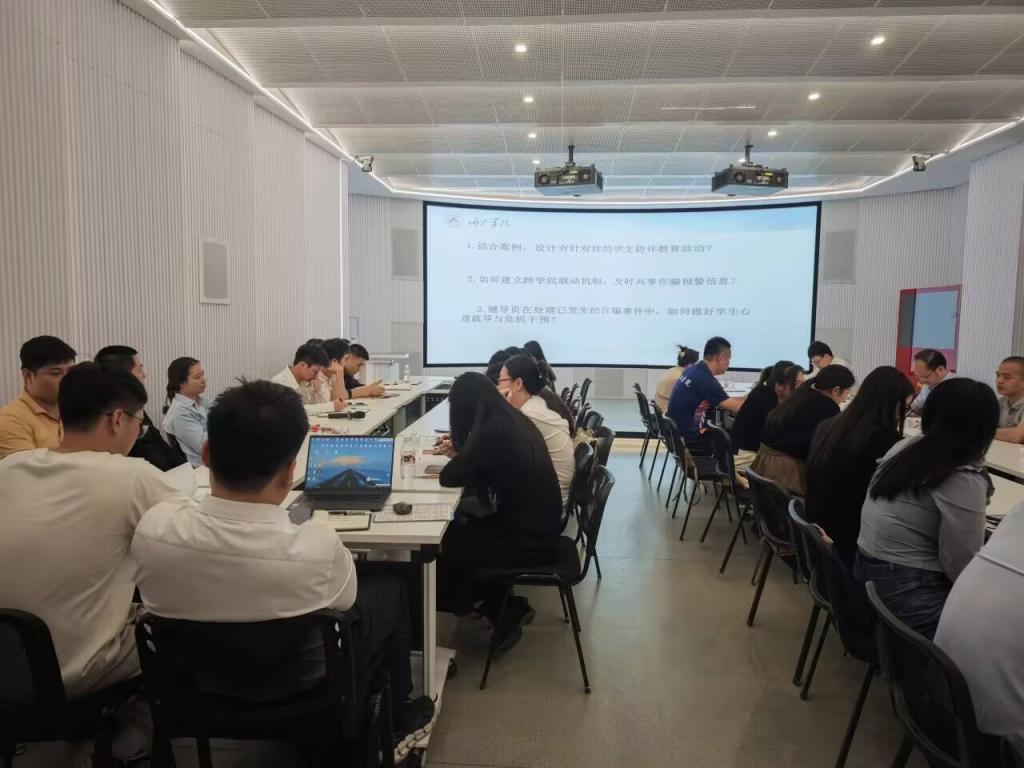 活动中,公共管理学院辅导员覃露兴和文学与传媒学院辅导员陈小薇,详细解析了网络诈骗的典型案例,帮助辅导员提升识别风险的敏感度。与会人员围绕“如何结合案例开展防诈教育”、“如何建立跨学院诈骗预警联动机制”以及“辅导员如何做好心理疏导与危机干预”等三个议题展开深入交流。