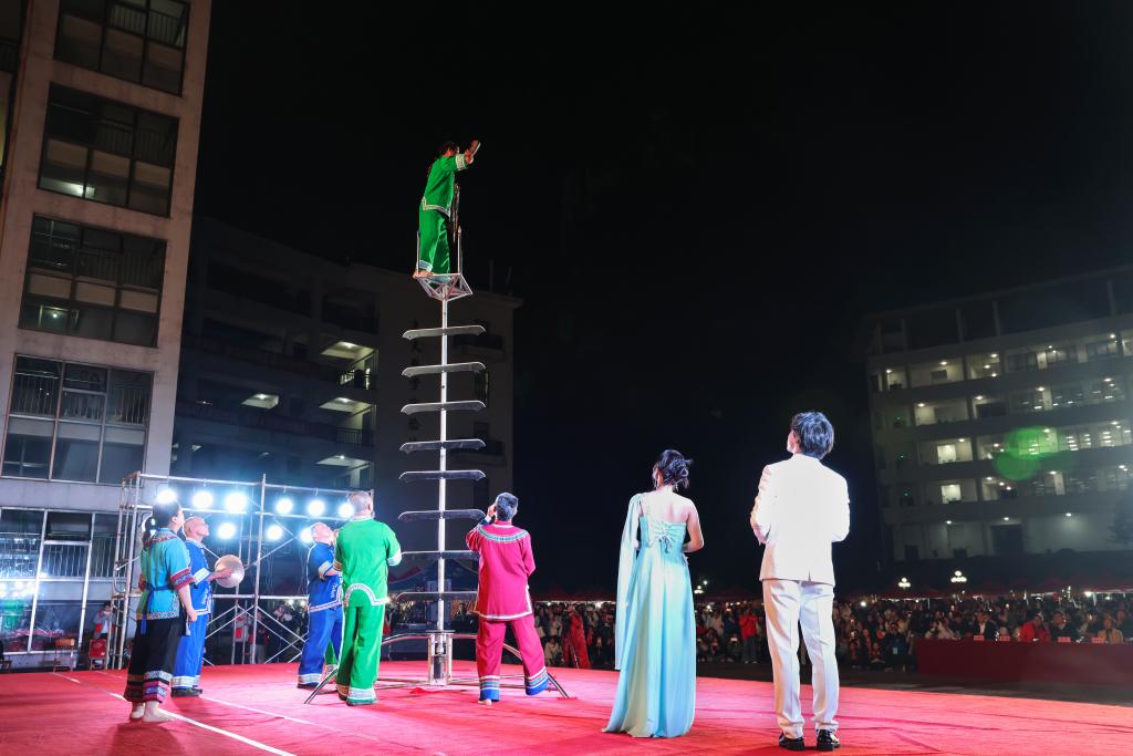 晚会现场气氛热烈,节目精彩纷呈。由共青团河池学院委员会、文化艺术中心联合各二级学院编排的《旋律大派对》、《刚柔并济狮武同源》、《中华颂》、《非遗迎新》等20个节目依次上演。歌舞表演激情洋溢,点燃全场热情;传统狮武刚柔并济,尽显文化底蕴;深情朗诵致敬华夏辉煌;情景表演引发青春共鸣;留学生节目展示多元文化交融;更有川剧变脸、刀山火海等非遗绝技,让传统艺术魅力在舞台上绚丽绽放。现代活力与传统文化在此交融碰撞,现场掌声如潮,喝彩不断。