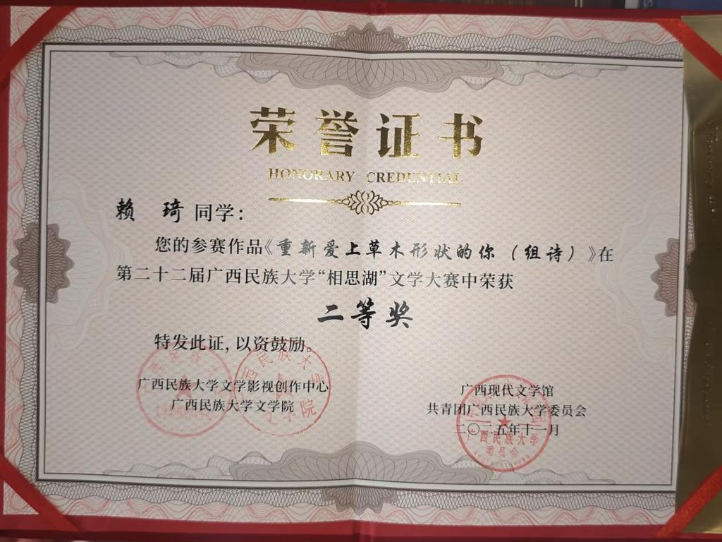 其中,白云诗社赖琦同学的诗歌作品《重新爱上草木形状的你》荣获二等奖,韦潞涵同学的散文作品《残忍的天真》荣获三等奖。