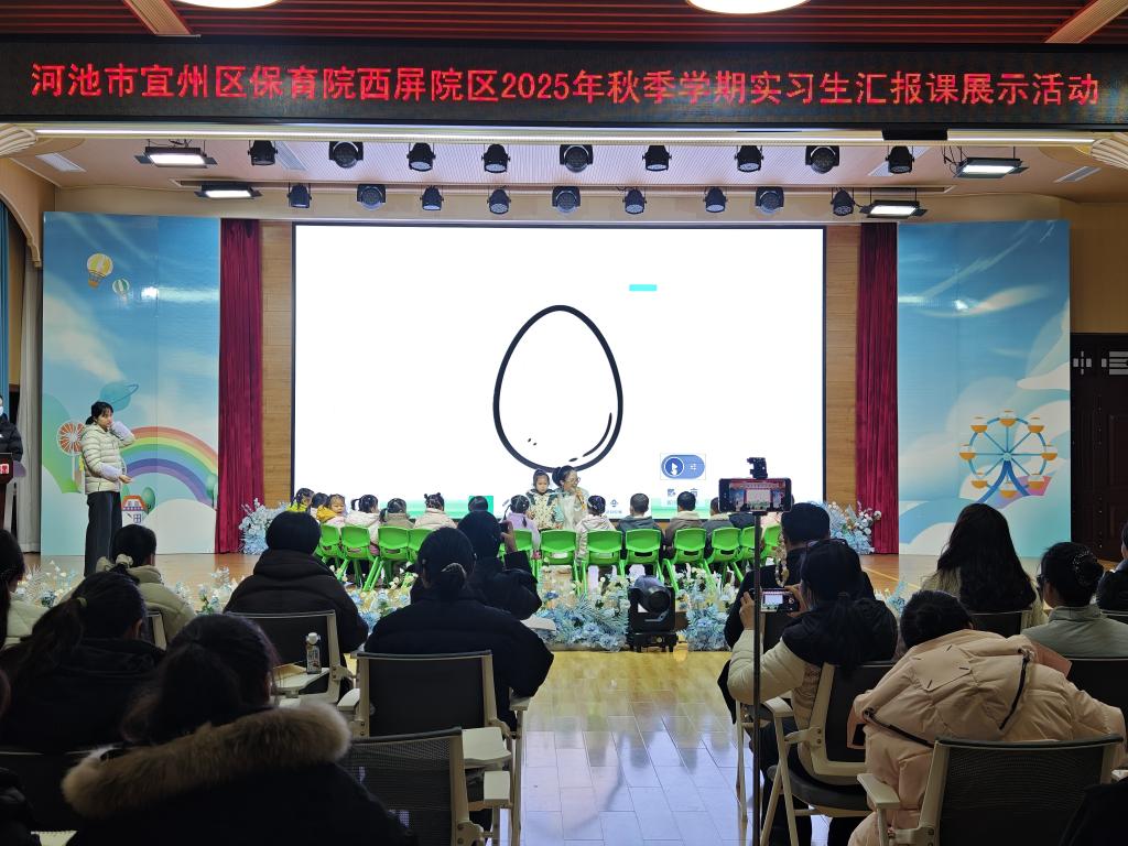 2025年12月24日上午,我院在河池市宜州区保育院西屏院校实习的学前教育专业241A班同学开展实习汇报课活动,师范技能教研室主任凌俐副教授和学前教育教研室教师黄怡冰、蒙素石、兰涛以及周虹等前往听课观摩指导。本次活动旨在检验学前教育专业实习生的教学实践成果,搭建交流提升平台,切实深化园校协同育人成效。