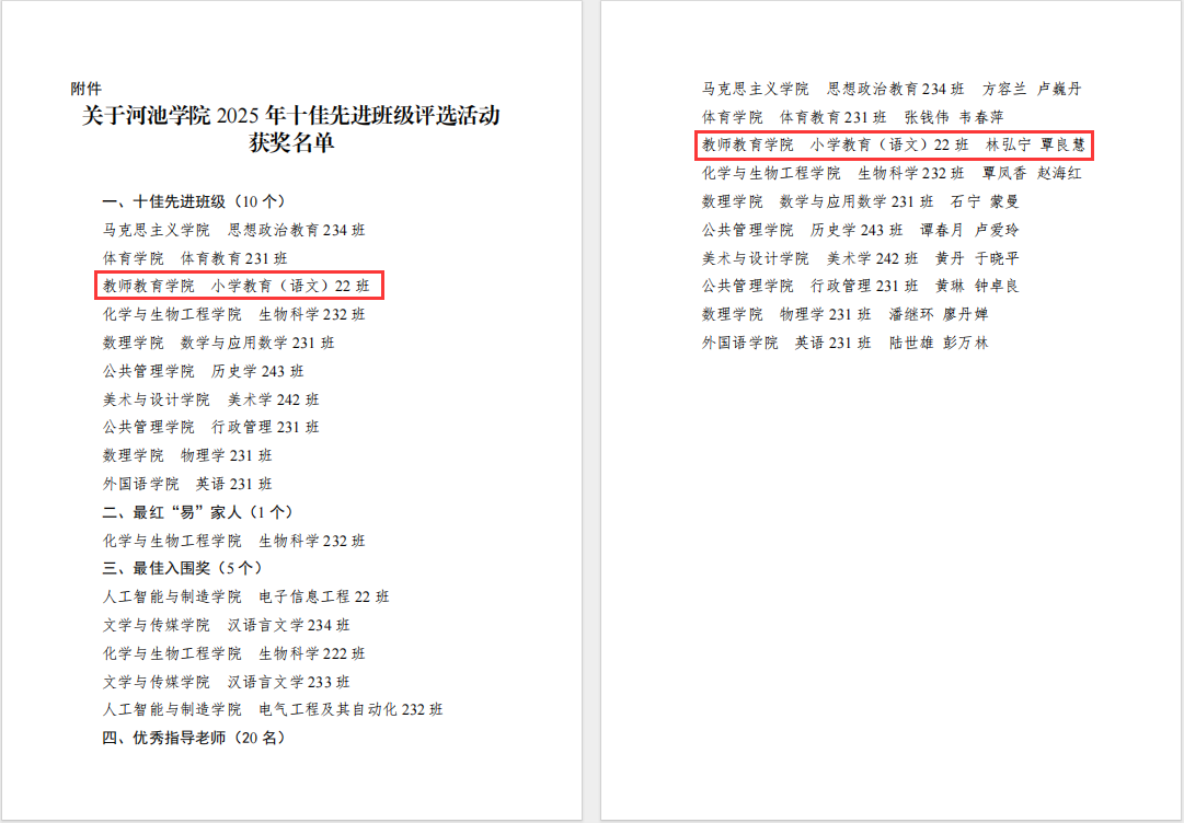 【来源:【喜讯】小语22班荣获河池学院2025年“十佳先进班级”称号 | 发布日期:2025-11-28 】