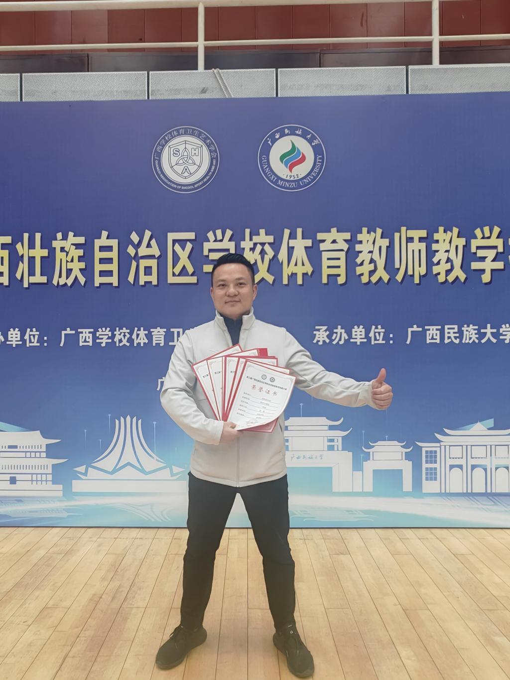 12月5日至7日,第三届广西壮族自治区学校体育教师教学技能大赛在广西民族大学落幕。我校选派银雪莉、成豪、肖斌、茹画、赵丹、韦入予六位老师由体育学院副院长王有基带队参加了此次比赛。他们在比赛中表现优异,凭借扎实的专业功底和出色的教学能力,在参加的本科高校体育专业理论组、体育专业术科组、公共体育组三个组别的角逐中共斩获13个奖项,展现出我校体育教师队伍卓越的教学水平和专业风采。