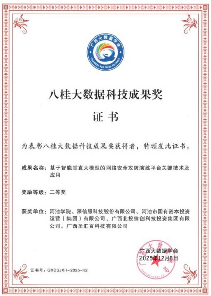近日,2025年度八桂大数据科技成果奖评选结果正式揭晓。由我校牵头申报的《基于智能垂直大模型的网络安全攻防演练平台关键技术及应用》项目,凭借显著的创新性与扎实的实用性,在众多参评项目中脱颖而出,成功斩获二等奖。