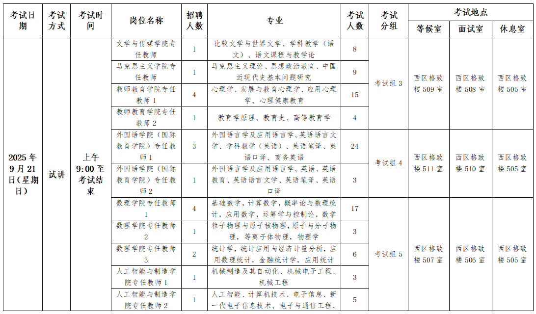 3.本次公开招聘考试资格审查时间为9月20日8:00--8:30、9月21日8:00--8:30。9月20日笔试资格审查地点在笔试考试教室;9月21日资格审核地点在面试、试讲等候室。