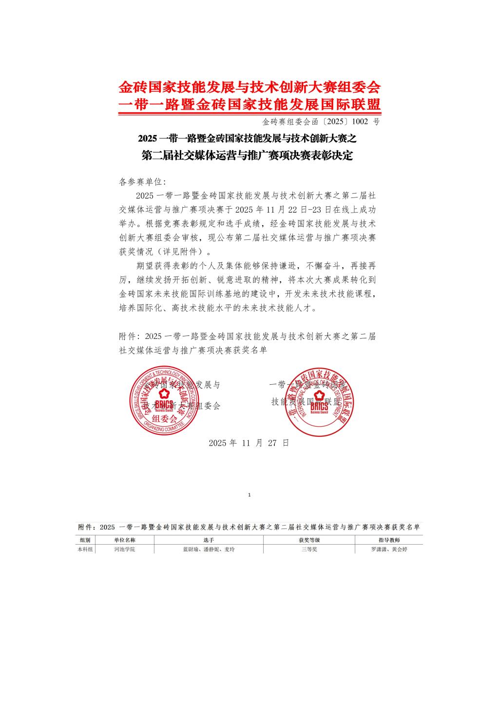近日,2025一带一路暨金砖国家技能发展与技术创新大赛第二届社交媒体运营与推广赛项全国总决赛(本科组)圆满落幕。外国语学院商务英语专业2023级蓝尉瑜、潘静妮、麦玲组成的参赛团队,在罗潇潇、黄会婷两位教师的指导下,凭借过硬的专业素养和出色的实战能力,从全国50支参赛队伍中脱颖而出,以排名第20的好成绩成功斩获三等奖。