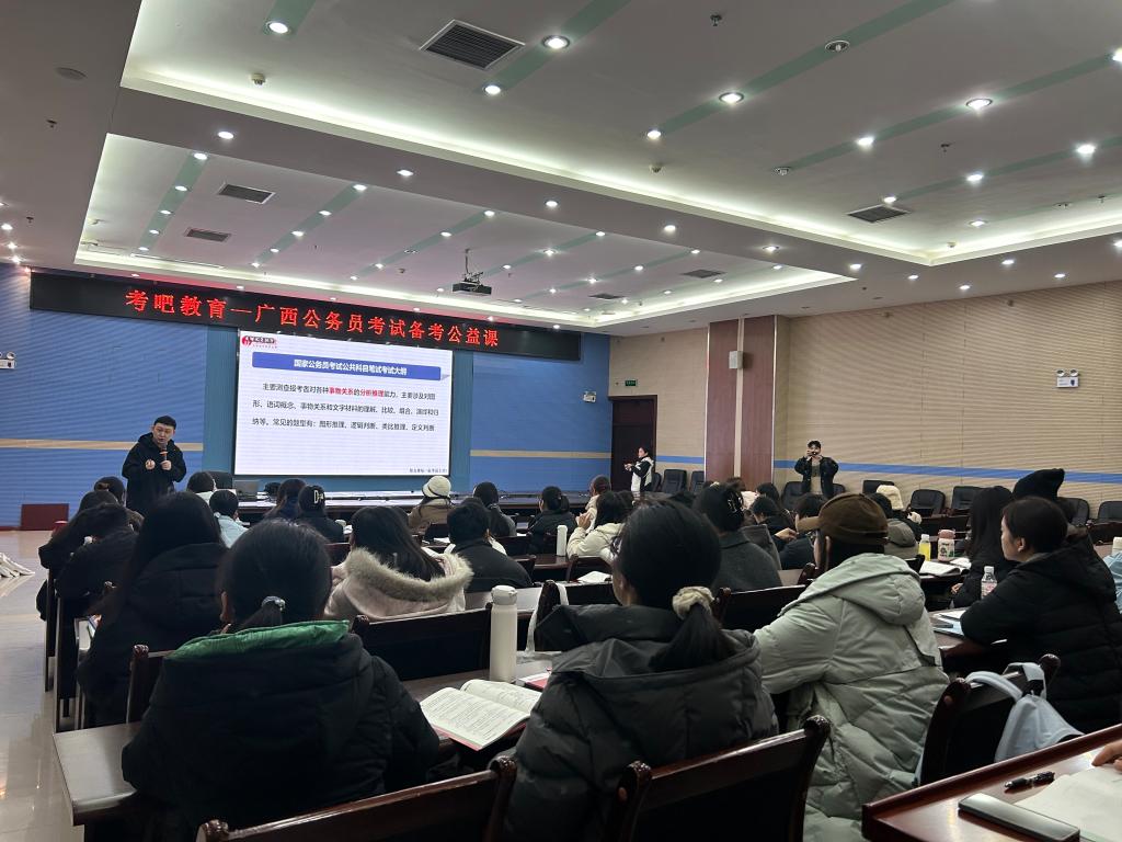 本次公益课聚焦广西公务员笔试核心科目,课程设置兼具系统性与针对性,全面覆盖行测、申论两大模块的核心考点与解题技巧。授课讲师结合历年广西公考真题,分别对言语理解与表达、判断推理、数量关系、资料分析三大题型进行深度拆解,同时围绕申论命题特点,从材料阅读、要点提炼、题型作答到文章写作进行全流程指导,破解公务员考试痛点。