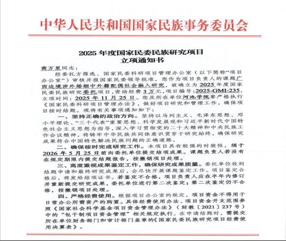 近期,我院教师商万里主持的“广西边境涉外婚姻中外籍配偶社会融入研究”课题获得2025年度国家民委民族研究项目立项,实现了我院该类项目立项零的突破。(作者:宾娜 校对:钟卓良、覃露兴审核:韦福)