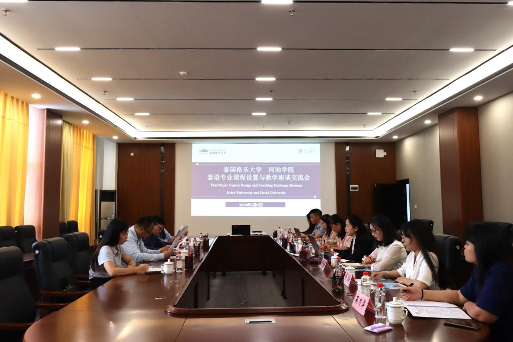 On June 6, 2024, a delegation of four members from the General Education Department of Faculty of Humanities at Krirk University in Thailand, led by Director Kiattichai Dejpitaksirikul, visited our university. During their visit, they conducted a special lecture on the Thai language study, held a project exchange meeting, and engaged in a discussion on the curriculum and teaching of the Thai language program. Attending the meeting from our university were Lin Na, Deputy Director of Office of International Exchange and Affairs of Hong Kong, Macao and Taiwan, and Deputy Dean of School of Foreign Studies (School of International Education), along with relevant faculty members.