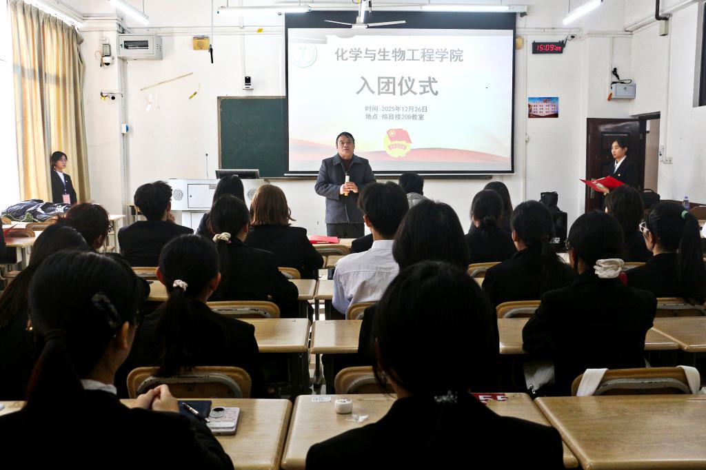 12月26日,化学与生物工程学院于格致楼208室举行2025年新团员入团仪式。学院党委书记覃宝山、团委书记谢恋情、辅导员代表、团委学生会成员及新老团员共同参加。