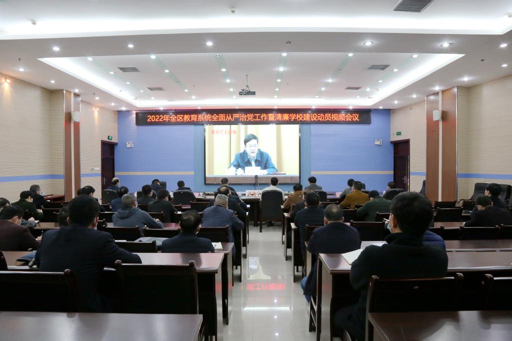 会议强调,2022年是我国踏上全面建设社会主义现代化国家、向第二个百年奋斗目标进军的重要一年,我们党将召开第二十次全国代表大会,做好全区教育系统全面从严治党工作,意义重大,责任重大。全区教育系统要坚持以习近平新时代中国特色社会主义思想为指导,全面贯彻党的十九大和十九届历次全会、中央纪委历次全会及自治区第十二次党代会精神,自觉运用党的百年奋斗历史经验,弘扬伟大建党精神,坚持稳中求进工作总基调,坚持全面从严治党战略方针,深刻认识“两个确立”的决定性意义,增强“四个意识”、坚定“四个自信”、做到“两个维护”,坚持不懈把教育系统全面从严治党向纵深推进,进一步压实压紧管党治校政治责任,坚持严的主基调不动摇,以实际行动和优异成绩迎接党的二十大胜利召开。一要坚决捍卫“两个确立”、做到“两个维护”,打造对党忠诚的坚强阵地。二要持续提升政治功能,推进基层党建全面进步、全面过硬。三要强化政治引领,提升思想政治工作质量和水平。四要驰而不息正风肃纪,持续营造风清气正的育人环境。五要强化政治责任落实,纵深推进全面从严治党走深走实。