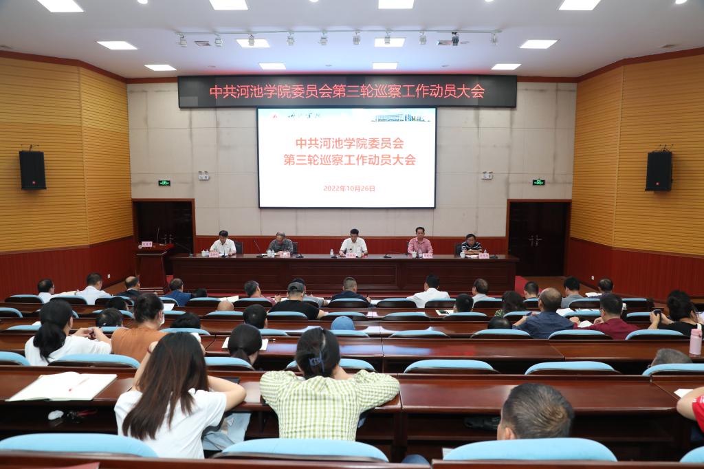 根据学校党委巡察工作统一部署,10月26日下午,在学校弘毅楼205报告厅召开中共河池学院第三届委员会第三轮巡察工作动员会,各巡察组正式进驻被巡察单位开展常规巡察和专项巡察。