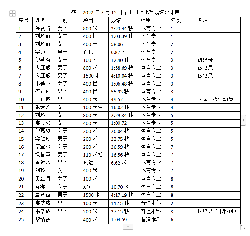 广西第十三届学生运动会田径比赛于7月8日-15日在广西民族大学举办,本次运动会旨在为2023年广西举办第一届全国学生(青年)运动会选拔优秀苗子。7月12日,河池学院代表团迎来了广西第十三届学生运动会的首金,截止目前共获得2金3银6铜,团体总分排在第3名,共有3人5次打破赛会记录,1人运动成绩达到国家一级运动员等级标准。(数据统计截止时间2022年7月13日早)