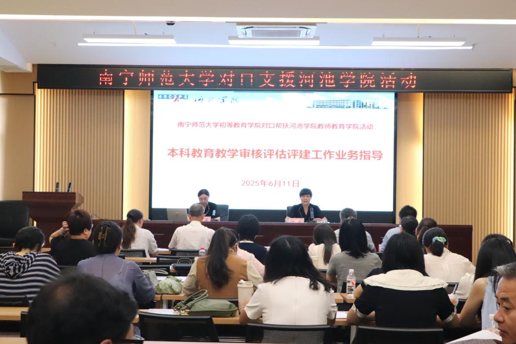 座谈会上,双方互相介绍了各自学院的办学成效与特色,对师范专业认证整改、人才培养方案修订等工作开展充分交流研讨。随后,梁宇作主题为“本科教育教学审核评估业务指导”的专题讲座,从评估理念、评估报告、人才培养、课程建设、教育教学、档案整理等方面为学院教职工进行了深入细致的面对面辅导。