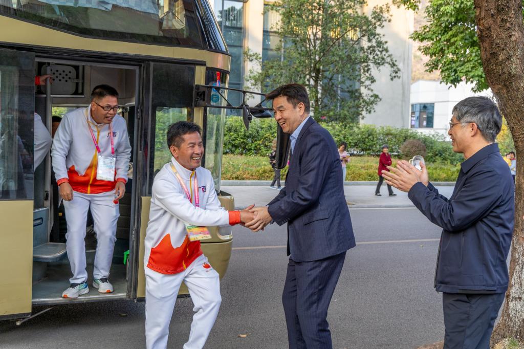 仪式现场,锣鼓喧天,掌声四起,四只威风凛凛的狮子在场地中跳跃、舞动,一派热闹喜庆景象。韦安光、马少健等校领导与独竹漂、板鞋运动队队员逐一亲切握手,学生代表为他们献上鲜花,向他们表示祝贺,鼓励他们继续秉承“平等、团结、拼搏、奋进”的宗旨,弘扬中华体育精神,传播民族体育正能量,砥砺前进,追求卓越,再立新功,为学校完善德智体美劳全面发展的育人体系,发挥体育在立德树人中的重要作用,作出新的更大贡献。