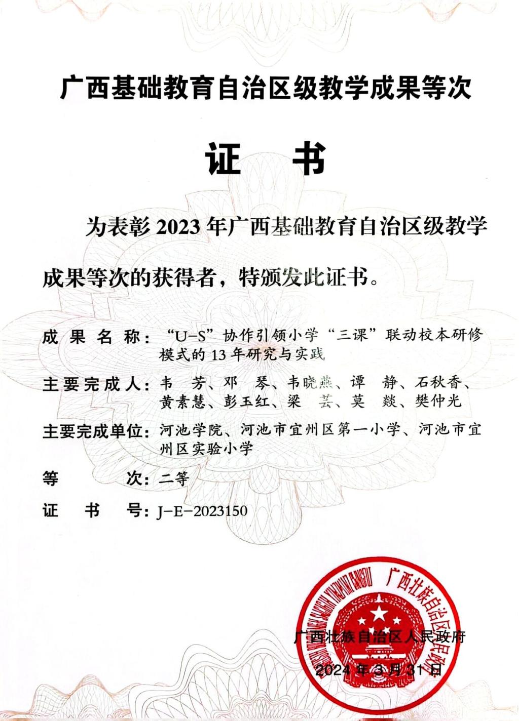 学院重视与基础教育深度衔接,以专业引领基础教育改革,以教研培训服务基础教育办学质量提升,以一线实践砥砺本院人才核心素养养成,形成了“地方教育行政部门、高校、一线学校”三位一体,“高校教师、一线教师、师范生”三级联动,集培养、培训、研究和服务一体化的教师协同培养机制,反哺专业发展。学院通过与宜州区第一小学、宜州区实验小学协同共建,通过卓越教师教育实验班、卓越教师工作坊、“双导师制”等培养载体,推进教师教育的高质量发展,开创民族地区、革命老区教师教育发展的新格局。常年邀请小学校长、特级教师参与人才培养过程,创设一线名师讲堂、教学科研交流等形式,在见习、实习、研习“三习”等长效合作方面成效显著。2021年“以卓越小学教师工作坊为依托的小学教师专业发展模式的研究与实践”获广西基础教育自治区级教学成果二等奖;2021年“民族地区地方高校小学教育专业卓越师范生双导师协同培养模式的研究与实践”获河池学院高等教育教学成果特等奖。